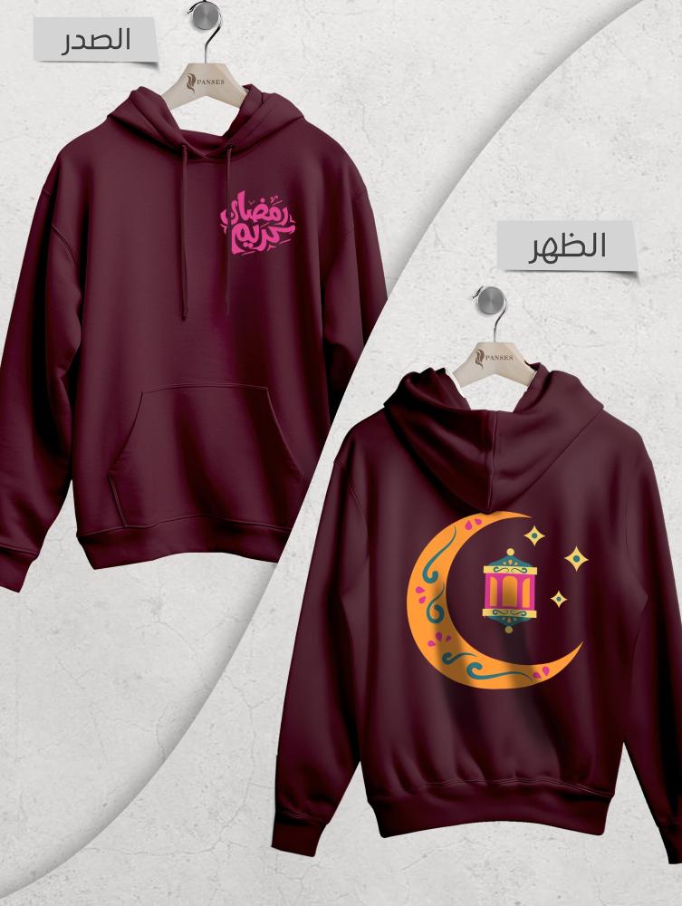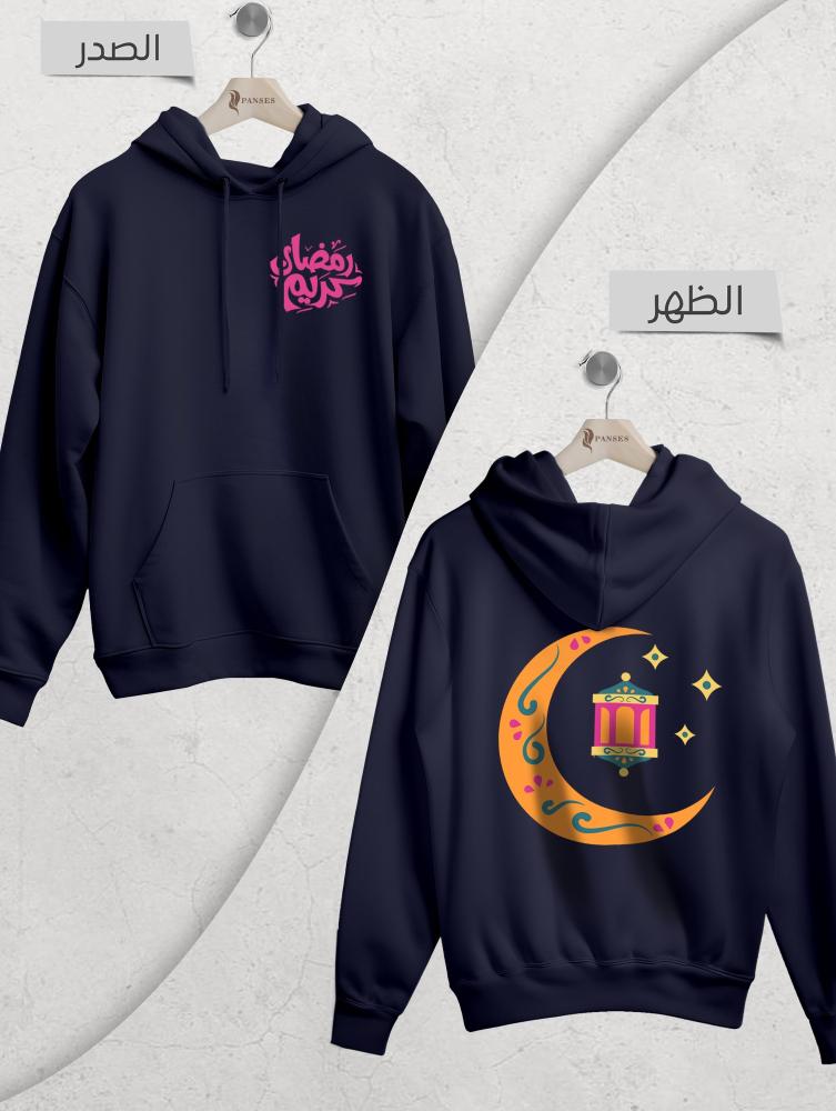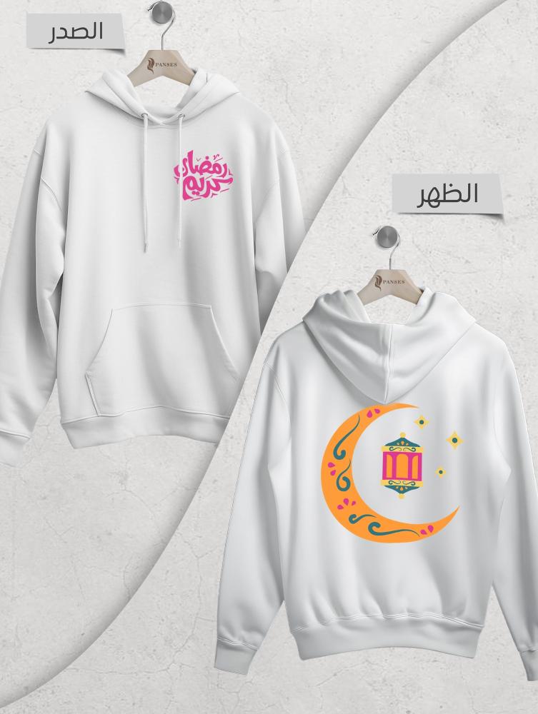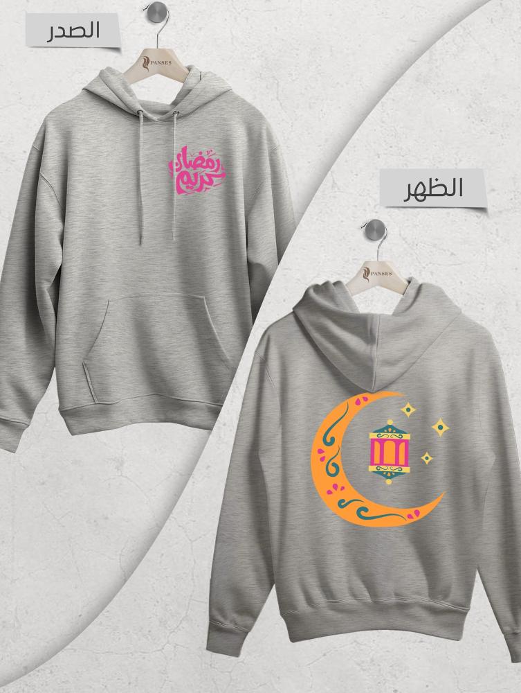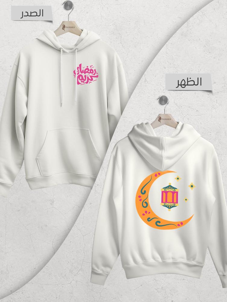 استمتع بأجواء رمضان بروح مميزة مع هذا الهودي الأنيق الذي يجمع بين البساطة والجمال في تصميم فريد. يأتي بطباعة عبارة "رمضان كريم" على الصدر بتصميم عصري ملفت، بينما يزين الظهر هلال مزخرف مع فانوس مضيء ولمسات زخرفية جميلة تعكس أجواء الشهر الفضيل. خيار مثالي لمحبي الأناقة والتميز في التجمعات الرمضانية.